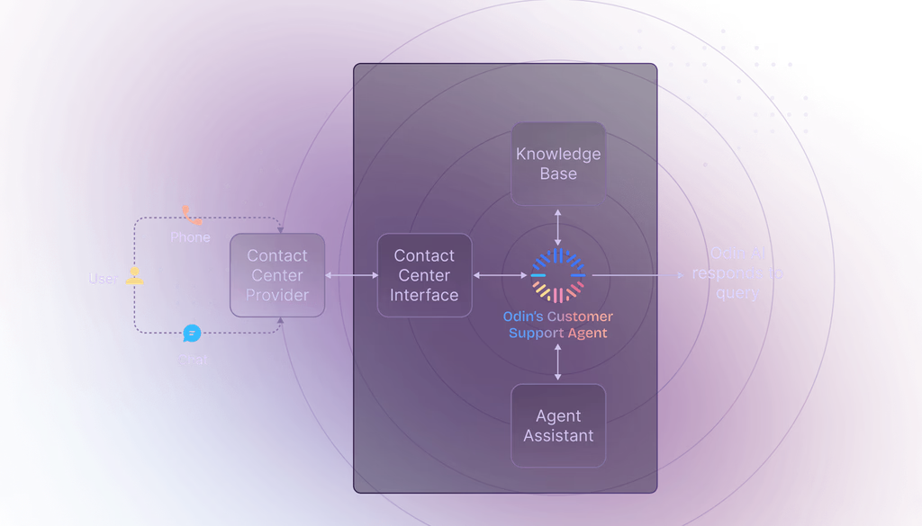 A flowchart depicting the integration of Odin AI in a call center. The user interacts via phone or chat with the contact center provider, which interfaces with Odin’s customer support agent. Odin AI responds to queries using a knowledge base and assists agents in real-time.