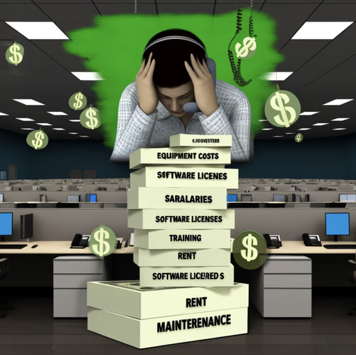 A stressed person in a modern call center, surrounded by labels like equipment costs, software licenses, salaries, and training, illustrating the financial burden of setting up a call center.